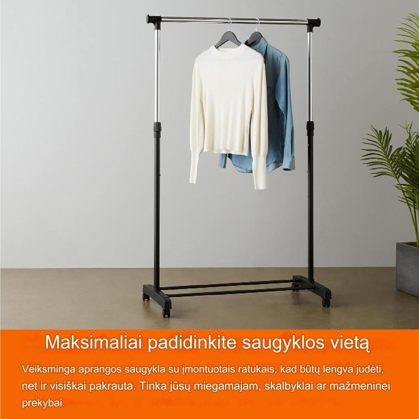 Stovas turi reguliuojamą teleskopinį dizainą. Jūs galite lengvai pritaikyti saugyklos vietą, kuri atitiktų jūsų erdvę ir drabužius.