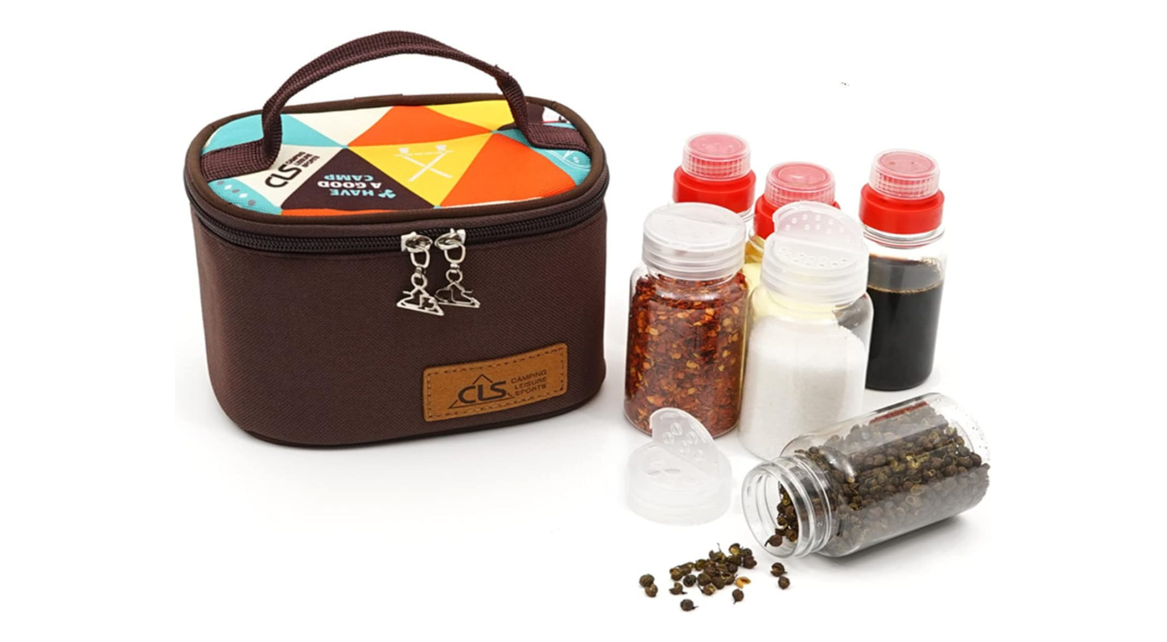 Nešiojamas stovyklavimo prieskonių rinkinys – Į komplektą įeina 3 tušti aliejaus buteliukai skysčių prieskoniams, tokiems kaip alyvuogių aliejus, actas, sojos padažas ir kt. Taip pat 3 tušti apvalūs indeliai miltelių prieskoniams: druskai, cukrui, kmynams, pipirams, džiovintoms žolelėms ir kitiems prieskonių milteliams laikyti.